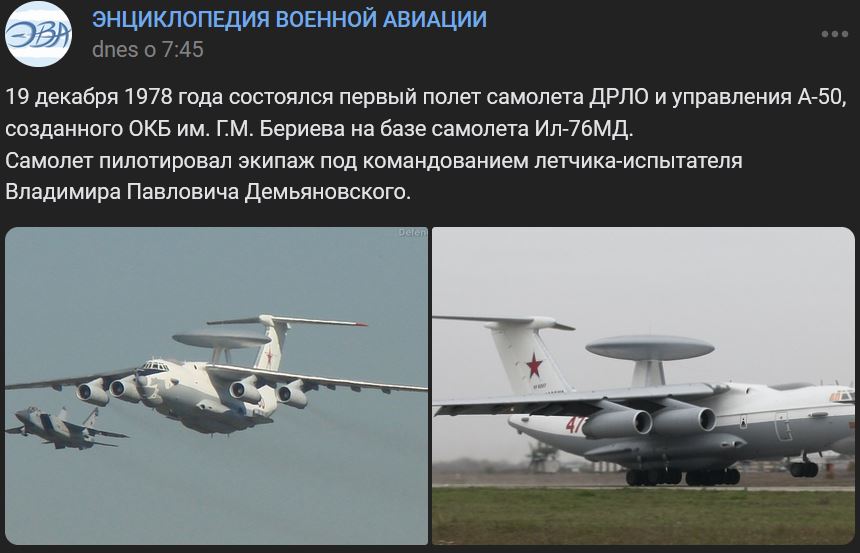 19.12.1978 = pred 45-timi rokmi sa uskutočnil prvý let radarového a riadiaceho lietadla DRLO A-50, ktoré vytvorila konštrukčná kancelária Berijev (ОКБ им. Г.М. Бериева) na základe lietadla Iľjušin IL-76MD (Ил-76МД). Lietadlo pilotovala posádka pod vedením skúšobného pilota Vladimira Pavloviča Demjanovskogo (Владимира Павловича Демьяновского).