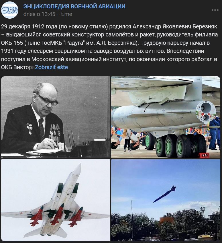 29.12.1912 (po novom kalendári) = pred 111 rokmi sa narodil Aleksandr Jakovlevič Bereznjak (Александр Яковлевич Березняк), významný sovietsky konštruktér lietadiel a rakiet, vedúci pobočky OKB-155 (ОКБ-155) (teraz Štátna konštrukčná kancelária "Raduga" A. Ja. Bereznjaka / ГосМКБ "Радуга" им. А.Я. Березняка). Svoju pracovnú kariéru začal v roku 1931 ako montér - zvárač v továrni na výrobu leteckých vrtúľ. Následne nastúpil na Moskovský letecký inštitút, po ktorého absolvovaní pracoval v konštrukčnej kancelárii Viktora Fjodoroviča Bolchovitinova (ОКБ Виктора Фёдоровича Болховитинова). V roku 1941 spolu s Aleksejem Michajlovičem Isajevym (Алексеем Михайловичем Исаевым) vyvinul stíhačku BI-1 (БИ-1) s kvapalinovým raketovým motorom (ŽRD/ЖРД). V rokoch 1943 až 1946 pracoval A. Bereznjak ako vedúci konštrukčného tímu v pobočke NII-1 (НИИ-1). V OKB-2 pracoval na vývoji experimentálneho nadzvukového lietadla s raketovým motorom na kvapalné palivo.