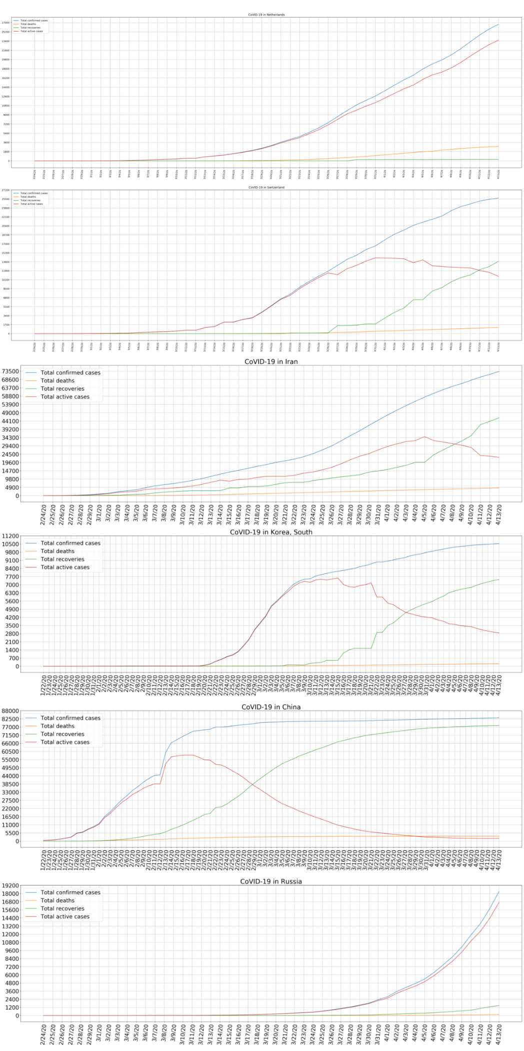 Grafy "dynamiky vývoje" COVID-19 na datech Johns Hopkins CSSE k 13.4