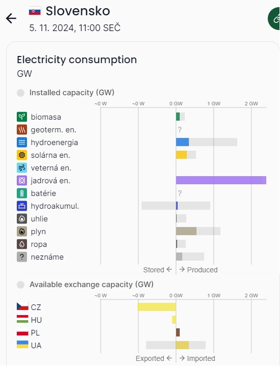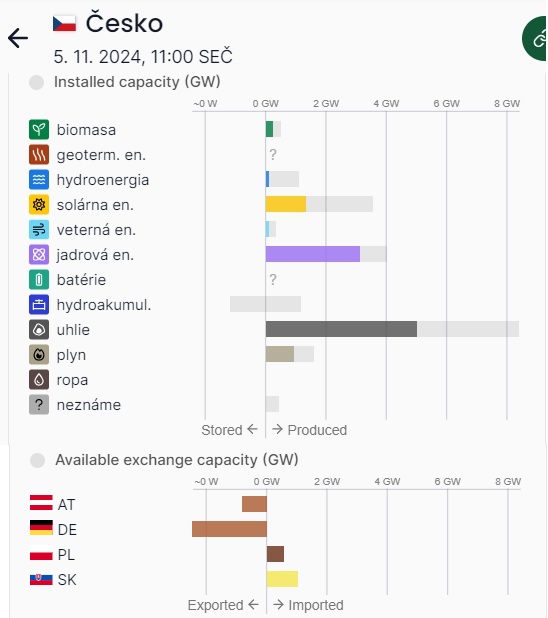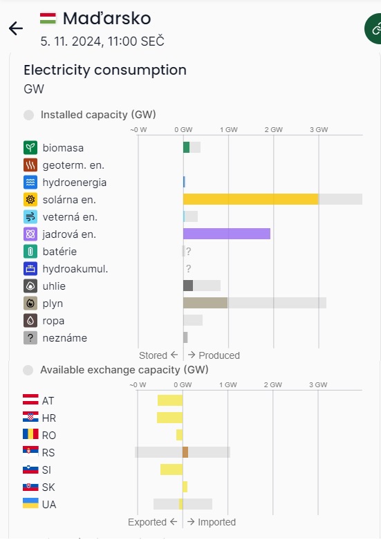Výroba a import/export elektriny podla jej povodu. Pre CZ, SK, HU. Podla www.electricitymaps.com