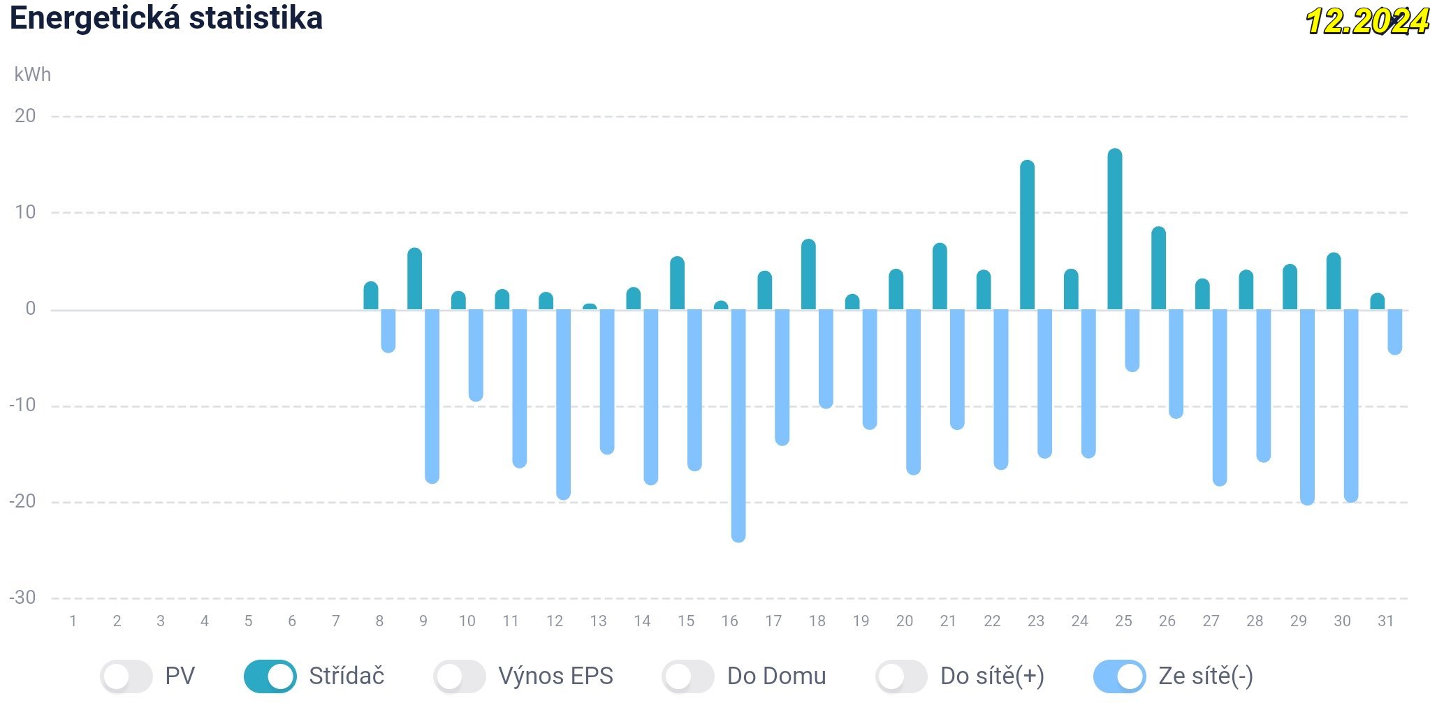 Pro ilustraci přihazuji graf z 23.12., kdy na pár hodin vylezlo slunko, typický graf ze včerejška, kdy jsme pod "duchnou" už pěkných pár dní a graf výroby za prosinec 2024. Zajímavý je graf ze včerejška, kde je vidět, že ze sítě se dobíjí i baterie, protože její kapacita klesla v důsledku nedobití FVE-polem pod kritickou mez a tak se pro ochranu baterie automaticky sepnulo dobíjení ze sítě!