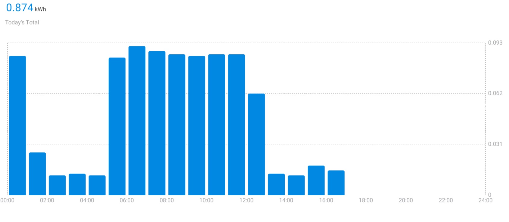 Mraznicka za den vyzera takto: Z grafu je vidno, ze sa zapina rano v case vychod slnka+30min a vypina zapad slnka - 30min.