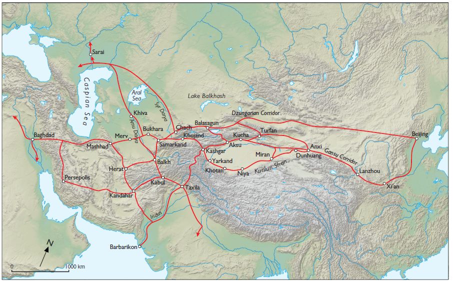 dialkovy obchod po Velkej stepy otvorilo širenie medi civilizaciou Sintašta z vychodnej oblasti Uralu na vychod asi roku 2500 pre Kristom a do Činy došli cez Džungársku bránu. Zo Strednej Azie do Činy bolo možne dôjst už okolo roku 3000 pred Kristom, ked bol objaveny tzv Gansu koridor z Tarimskej kotliny. Už predtym ale existovali cesty z Afganistanu do Indie, Mezopotamie a Egypta, ktoru spustil obchod Indov s lapis lazuli. Dalej spojenia s Bactriou a Centralnou Aziou s Tibetom a Mongolskom. Medzi inym bud z Mongolska, alebo Tibetu pochadzal borax použivany v starovekom mikenskom šperkarstve. Akym spôsobom došli predkovia Mongolov alebo Tibetanov na vyhodu použit borax v metalurgii je zahadou.
