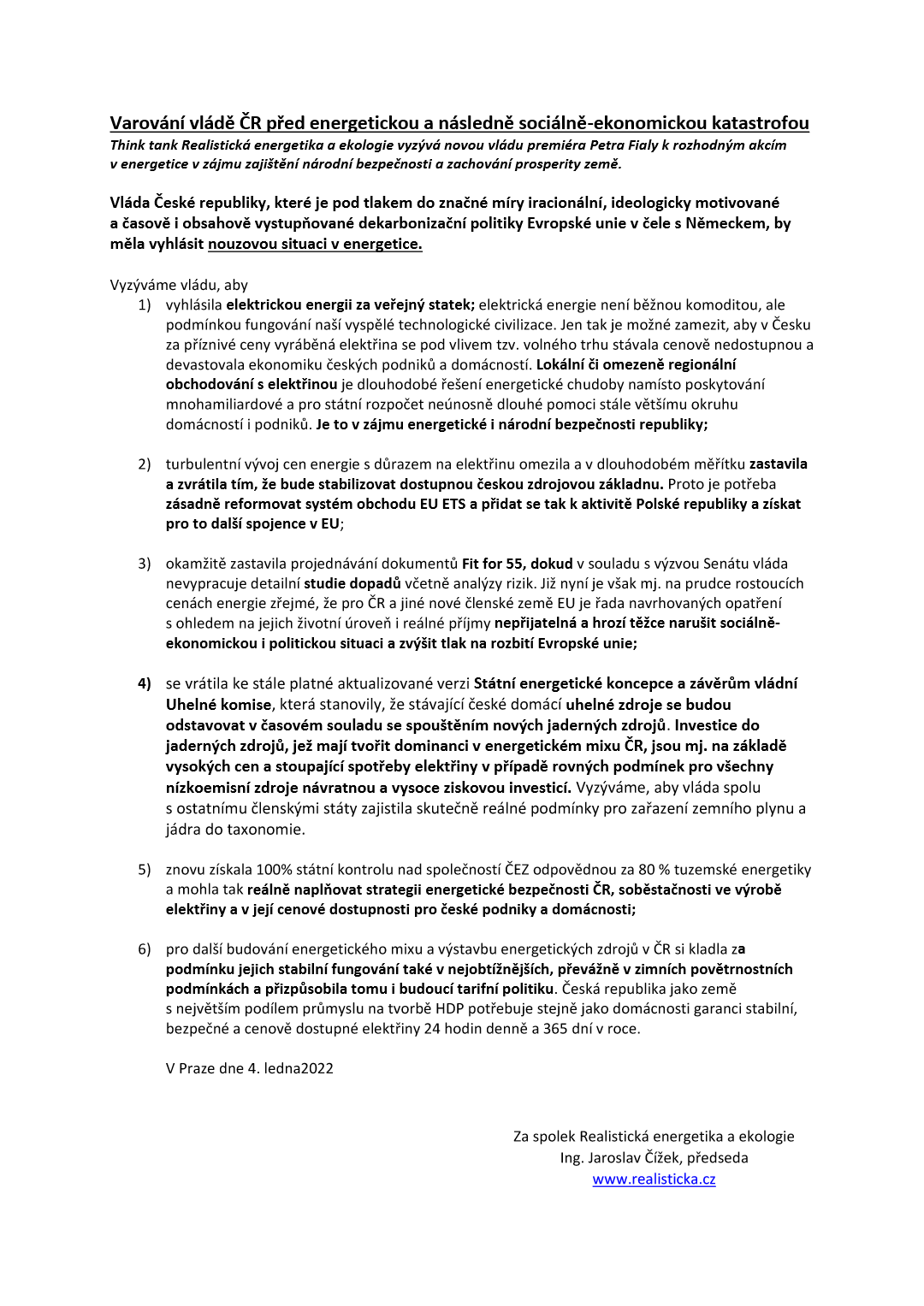 Ve své tříkrálové výzvě think tank Realistická energetika a ekologie varoval vládu ČR, že prohlubování současné energetické krize může vést k devastaci rozpočtů a budoucnosti českých podniků a domácností. Energetickou krizi tedy nelze dlouhodobě a systémově řešit nějakými “zelenými žebračenkami”, subvencemi nebo daňovými úlevami.