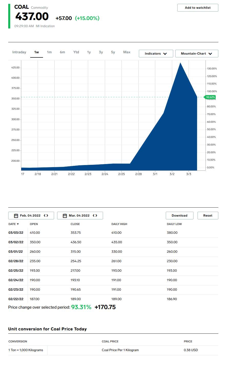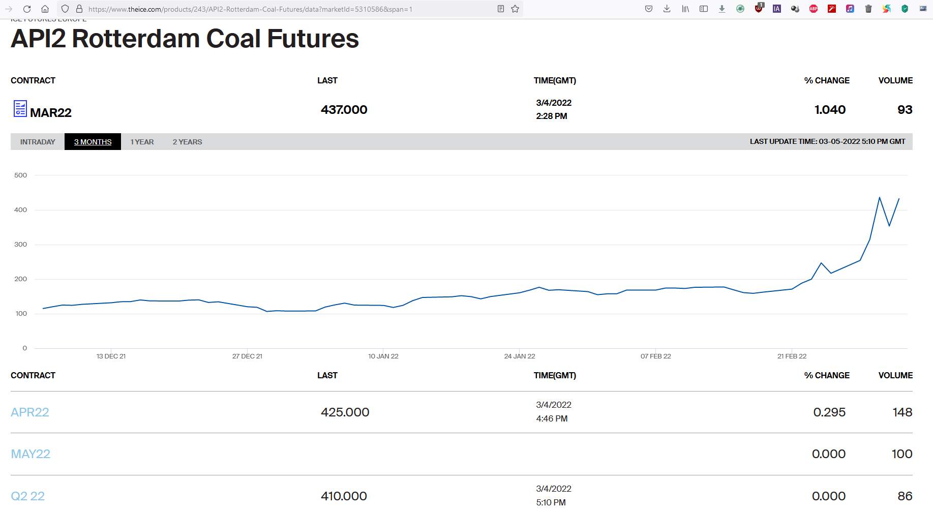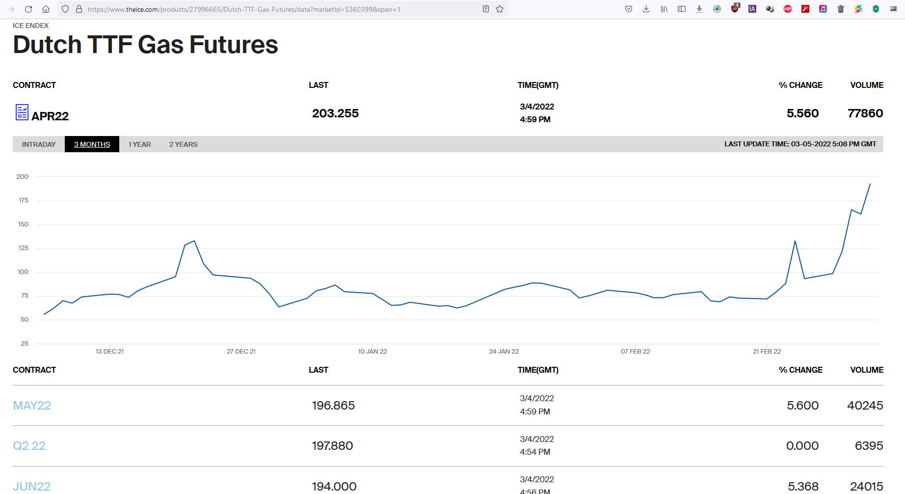 Podľa údajov londýnskej burzy ICE dosiahla cena plynu na európskej burze už 3. deň po sebe historický rekord, keď počas dnešného obchodovania dosiahla takmer 2400$ za 1000m3. Cena aprílových (04/2022) futures kontraktov v holandskom uzle TTF vzrástla na 2391,6$ za 1000m3, čo predstavuje 212€ za MWh. Celkovo sa cena plynu od začiatku obchodovania zvýšila o viac ako 31%. Predchádzajúci deň 03.03.2022 bol prekonaný rekord v cene modrého paliva - cena sa zvýšila na 2279$ za 1000m3 čo predstavuje 198,56€ za MWh.