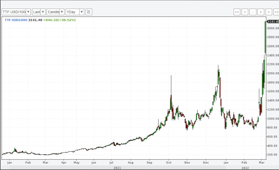 Citelný nárůst cen plynu začal v Evropě již minulé jaro, průměrná cena spotu podle indexu uzlu TTF tenkrát kolísala v rozmezí 250-300 dolarů za tisíc krychlových metrů. Koncem léta překročila cena smlouvy na dodávku „den předem“ 600 dolarů a na začátku října činila již 1 000 dolarů. Historického maxima 2 411 dolarů bylo dosaženo 4. března a to bylo nejednou obnoveno během obchodování 7. března.