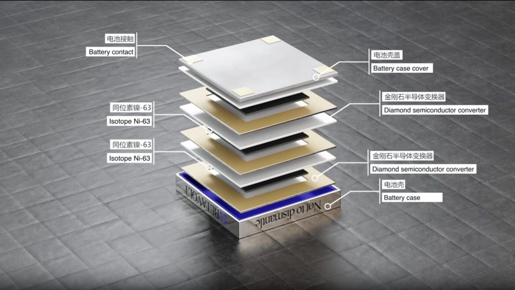 Na rozdiel od klasických termálnych rádioizotopových zdrojov s plutoniom 238Pu pracuje s nikom 63Ni (polčas 100 rokov) a princípom funkcie sa podobá slnečným batériám, ale na rozdiel od svetla je ožiarená elektronmi z betarozpadu 63Ni (dá sa ale použiť napríklad i trícium 3H - aj také zdroje existujú). Rádioaktívneho niklu je v "súčiastke" dosť - uvádzajú aktivitu štruktúry 10Ci/g, a aktivita 63Ni je 59Ci/g.