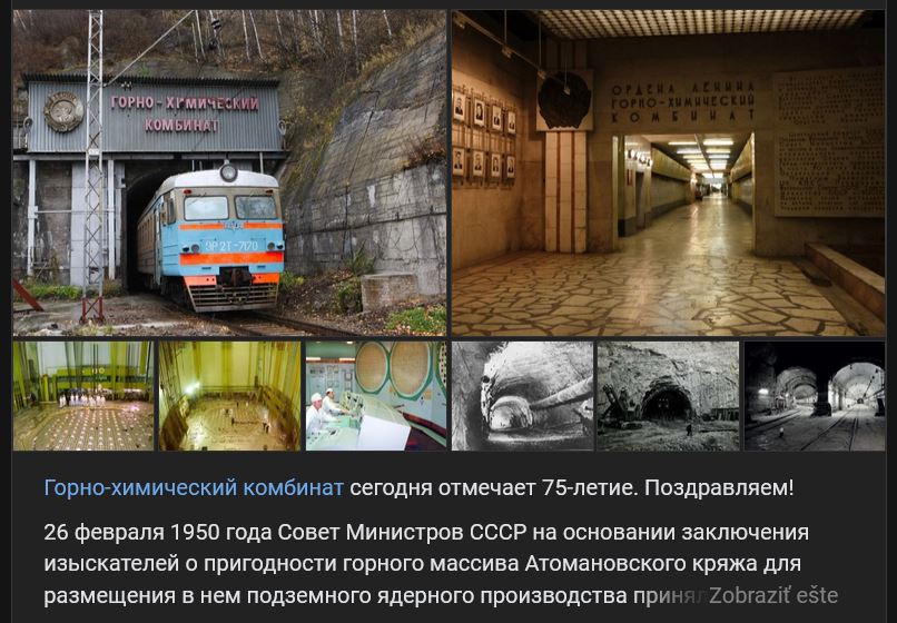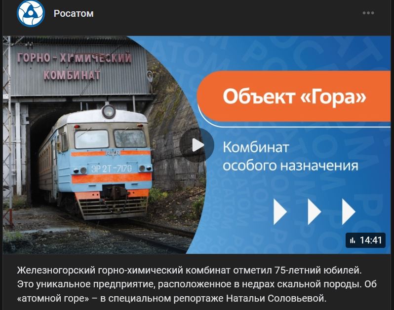 Železnogorský bansko-chemický kombinát oslávil 75. výročie svojho vzniku. Ide o jedinečný podnik nachádzajúci sa v hlbinách skalného podložia. „Atómová hora“ je predmetom špeciálnej reportáže Nataľi Solovievoj (Натальи Соловьевой). Video https://vk.com/video-37706009_456242323 dĺžka 14:41 min.