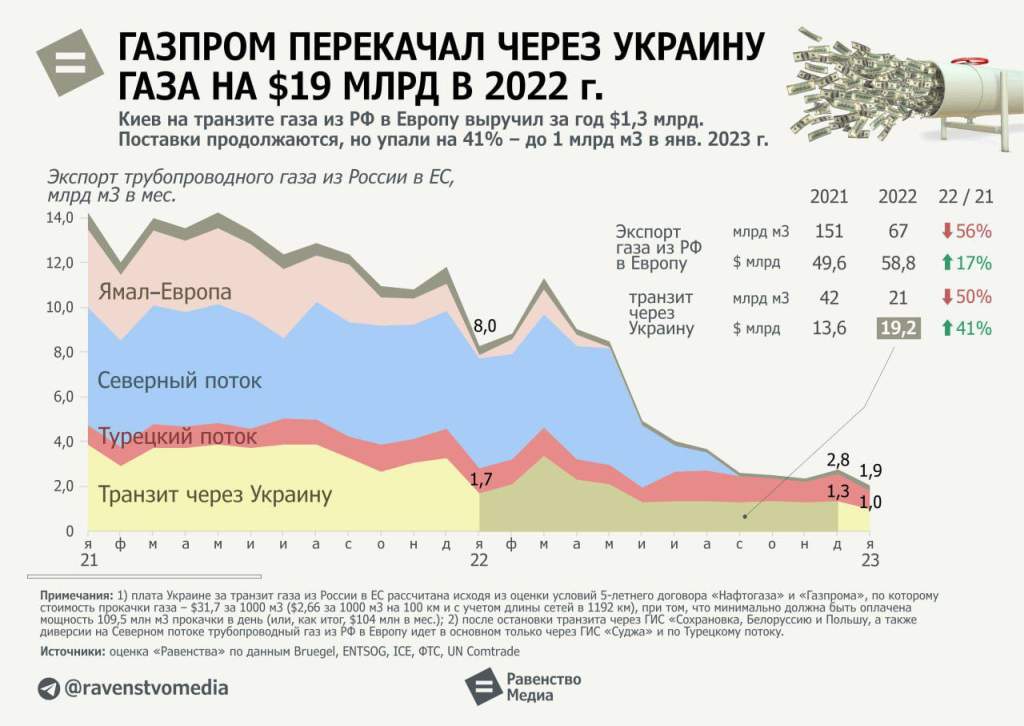 Dodávky plynu potrubím z Ruska do EÚ sa v roku 2022 zvýšili na 56 miliárd $, čo je o 17% viac ako v roku 2021. Tranzit cez Ukrajinu presiahol 19,2 miliardy $ (+41%). Príjmy Kyjeva z tranzitu plynu predstavujú viac ako 1,3 miliardy $.