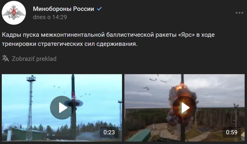 Zábery zo štartu medzikontinentálnej balistickej rakety "Jars" (Ярс) počas cvičenia strategických odstrašujúcich síl. Zdroj https://vk.com/wall-133441491_948616 z 26.10.2022
