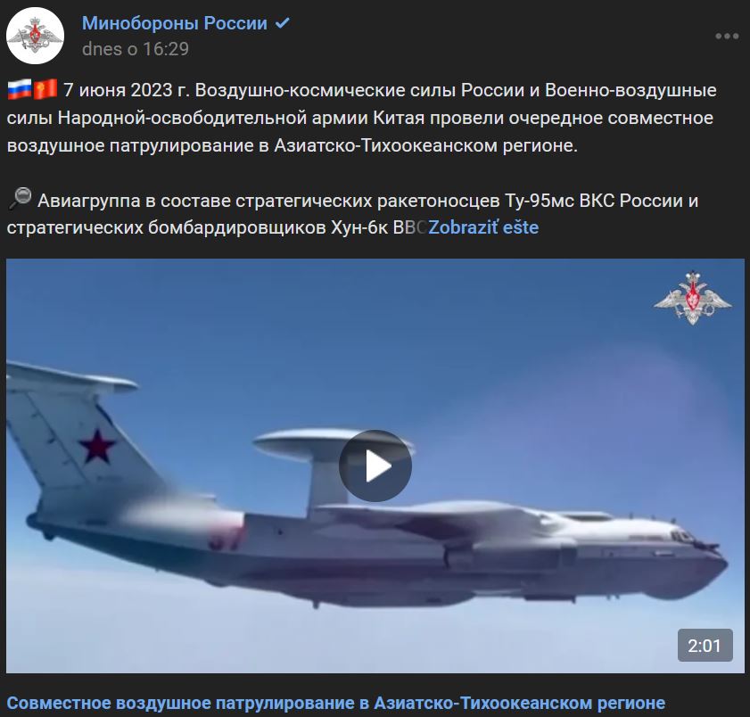 V stredu 07.06.2023 uskutočnili Vzdušno-Kozmické sily Ruska a Vzdušné sily Číny ďalšiu spoločnú leteckú hliadku v ázijsko-tichomorskom regióne. Letecká skupina zložená zo strategických raketových nosičov Tupolev Tu-95MS (Ту-95мс) VKS Ruska a strategických bombardérov Xian H-6 (轰-6/) Čínskeho letectva vykonávala letecké hliadkovanie nad vodami Japonského mora a Východočínskeho mora, západnej časti Tichého oceánu. Spoločný let ruských a čínskych lietadiel trval približne 8 hodín. Letecké krytie na celej trase spoločného hliadkovania zabezpečovali lietadlá Suchoj Su-30SM (Су-30см), Su-35S (Су-35с) VKS Ruska a lietadlá Shenyang J-11B (歼-11) čínskych vzdušných síl. Lietadlá VKS Ruska počas spoločných leteckých hliadok pristávali a štartovali z letiska v Čínskej ľudovej republike. Strategické raketové nosiče na niektorých úsekoch trasy sprevádzali zahraničné lietadlá. Počas svojich misií lietadlá oboch krajín postupovali prísne v súlade s ustanoveniami medzinárodného práva. Nedošlo k narušeniu cudzieho vzdušného priestoru. Po ukončení spoločnej leteckej hliadky sa všetky zúčastnené lietadlá vrátili na svoje letiská odkiaľ pôsobili. Cvičenie sa uskutočnilo na základe ustanovení Plánu vojenskej spolupráce na rok 2023 a nebolo namierené proti tretím krajinám.