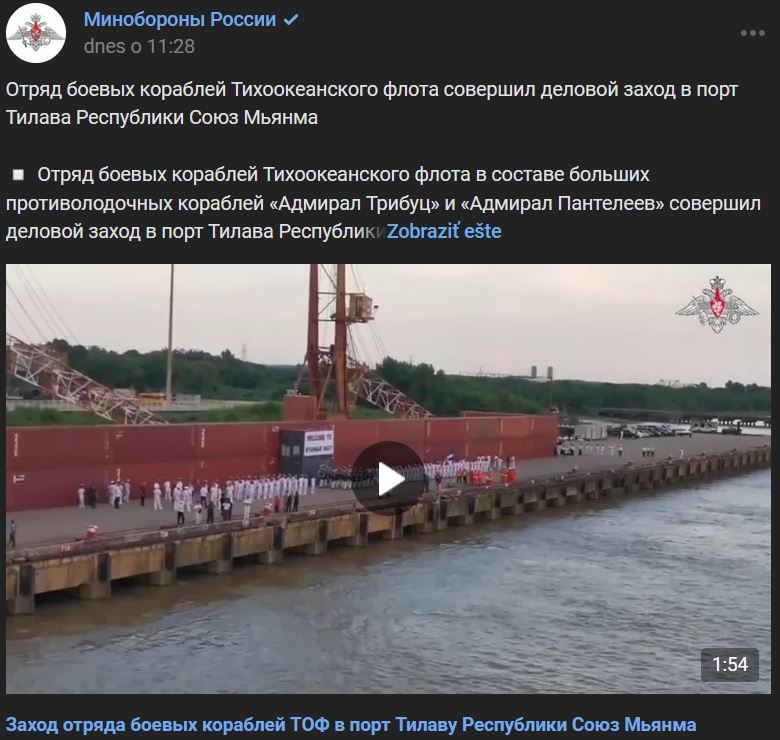 Oddiel bojových lodí TOF pozostávajúci z veľkých protiponorkových lodí "Admiral Tribuc" (Адмирал Трибуц) a "Admiral Pantelejev" (Адмирал Пантелеев) uskutočnil pracovnú návštevu prístavu Thilawa v Mjanmarskej republike. Deň predtým oddiel preplával Andamanské more, kde si precvičil pridelené úlohy počas diaľkovej námornej kampane v ázijsko-tichomorskom regióne. V rámci plavby ruských lodí sa uskutoční slávnostný otvárací ceremoniál prvého spoločného námorného cvičenia ruských a mjanmarských námorných síl, naplánované sú vzájomné návštevy lodí vojenskými pridelencami oboch krajín, športové a kultúrne podujatia. Plánuje sa, že návšteva lodí TOF v Thilawe potrvá do utorka 07.11.2023. Video https://vk.com/video-133441491_456272033 dĺžka 1:54 min.