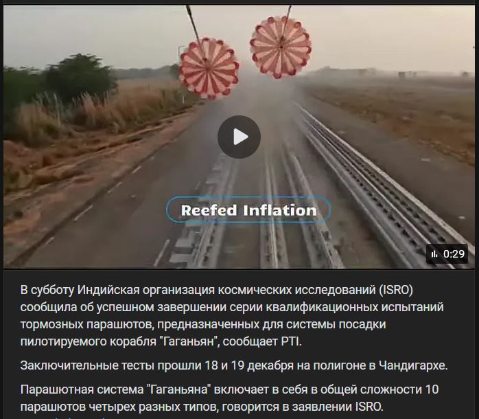 V sobotu 20.12.2025 Indická organizácia pre vesmírny výskum (ISRO) oznámila úspešné ukončenie série kvalifikačných testov brzdných padákov určených pre systém pristátia pilotovanej lode „Gaganyaan“, informuje PTI.