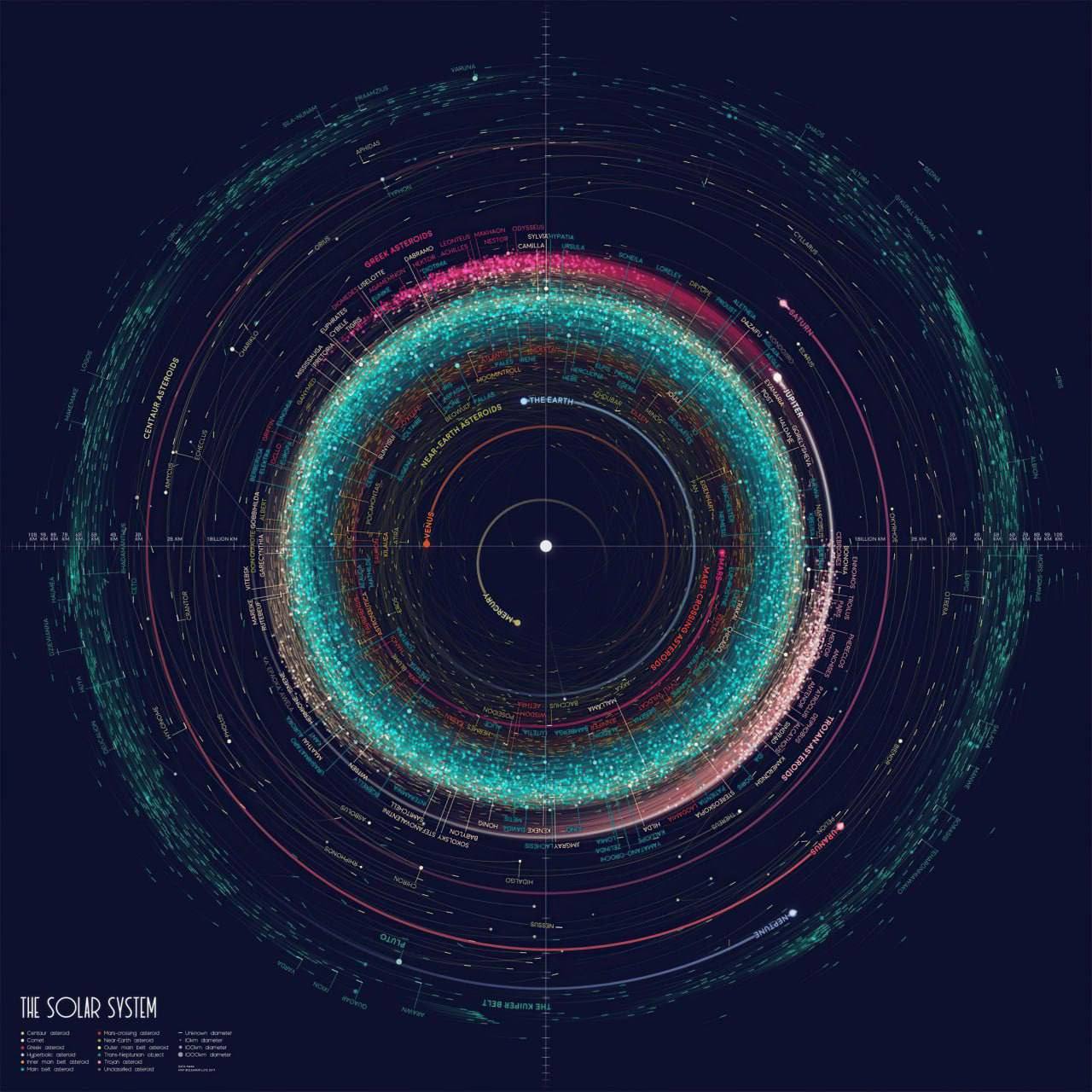 Mapa asteroidov v slnečnej sústave. Mapa zobrazuje dráhy viac ako 18 tisíc asteroidov. Približne 10 tisíc z nich má priemer 10 km alebo viac.