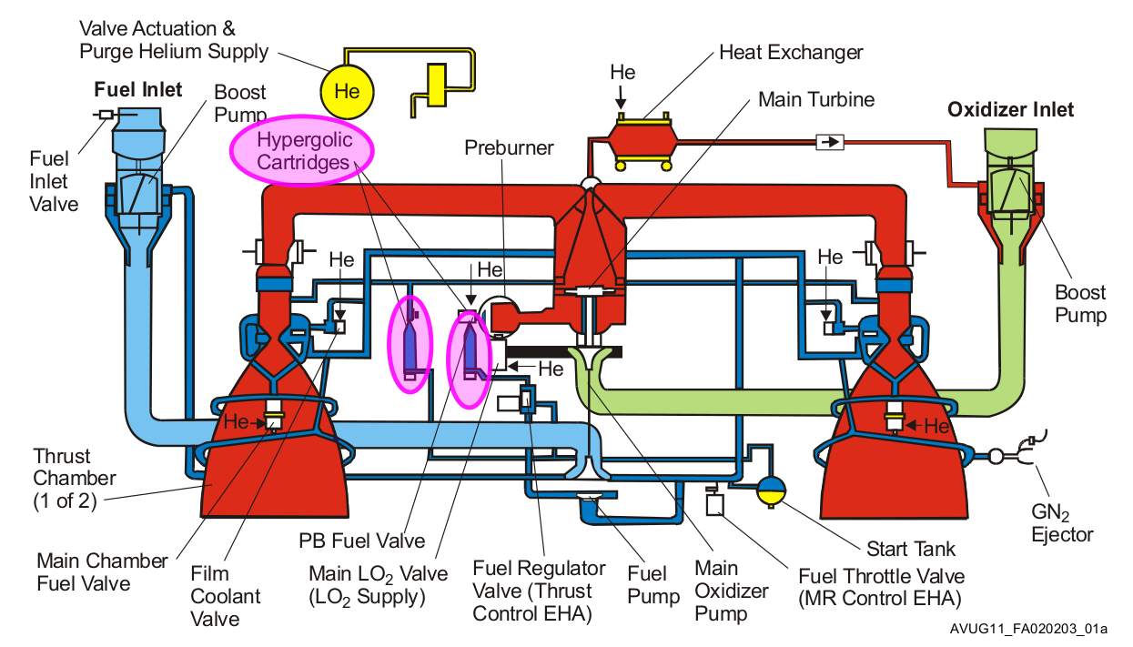 Vpravo je patrona zapalovania spalovacej komory turbočerpadlového agregátu, spúšťa sa ako vôbec prvá vec - tlakom helia v štartovacej nádrži (žltomodrá vpavo) je palivo s hypergolom vytlačené do spalovacej komory a vzniknuté plyny roztáčajú turbínu, ktorá začína hnať čerpadlá - ako sa natlakovaný kyslík dostane do spalovacej komory turbočerpadlového agregátu, prechádza turbočerpadlový agregát na "normálny režim" a tlačí palivo a okysličovadlo do spalovacích komôr. Vtedy je vpustený prietok paliva do ľavej patrony s hypergolom a palivo-hypergolická zmes je následne vytlačená do vstrekovacích hláv a pri styku s kyslíkom vzplanie a zapáli komory - motor nabieha na normálny režim. Celý tento proces prebehne asi za 2-3 sekundy - o dosť rýchlejšie než trvá prečítať jeho popis.