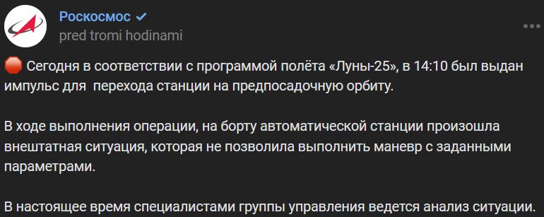 V sobotu 19.08.2023 v súlade s letovým programom Luny-25 bol o 14:10 hod. v súlade s letovým programom vydaný impulz na prechod stanice na pred-pristávaciu obežnú dráhu. Počas vyplnenia operácie nastala na palube automatickej stanice mimoriadna situácia, ktorá neumožnila vykonať manéver so stanovenými parametrami. V súčasnosti špecialisti kontrolnej skupiny analyzujú situáciu. Zdroj https://vk.com/wall-30315369_567849 z 19.08.2023