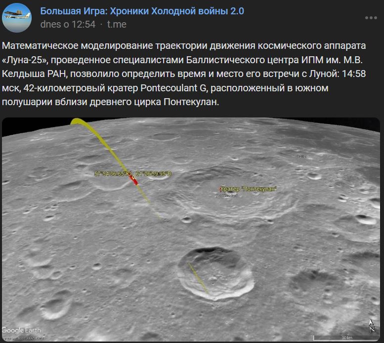 Matematické modelovanie trajektórie letu kozmického aparátu Luna-25 (Луна-25), ktoré vykonali odborníci z Balistického centra IPM pomenovanom po M.V.Keldyša Ruskej akadémie vied (Баллистического центра ИПМ им. М.В. Келдыша РАН), umožnilo určiť čas a miesto jej stretnutia s Mesiacom: dopad o 14:58 hod. MSK, 42-kilometrový kráter Pontecoulant G, ktorý sa nachádza na južnej pologuli.
