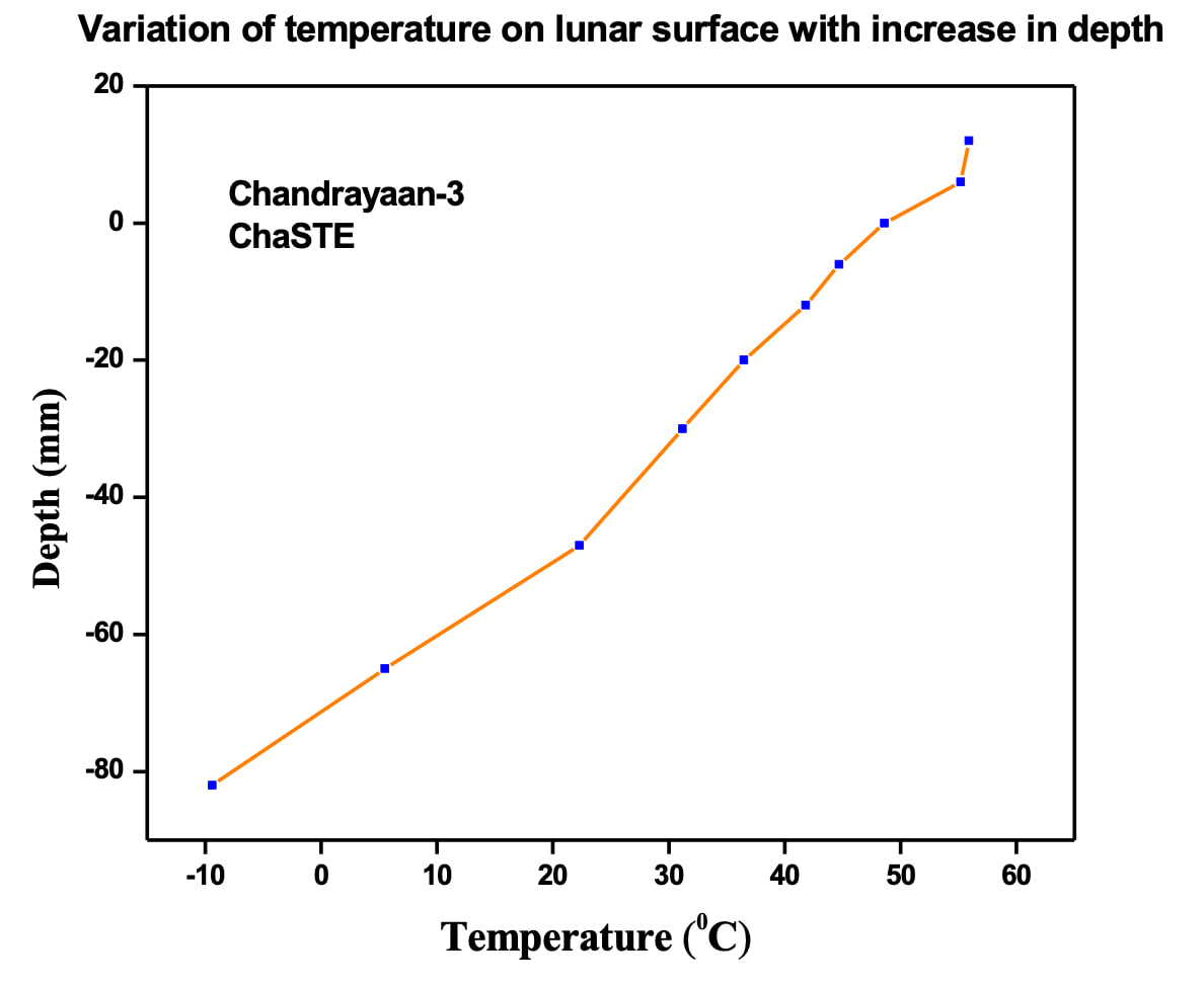 Podle grafu, který představila Indická organizace pro výzkum vesmíru, je teplota v hloubce 8 cm asi -10 stupňů Celsia, zatímco na povrchu Měsíce je asi +60 stupňů Celsia.