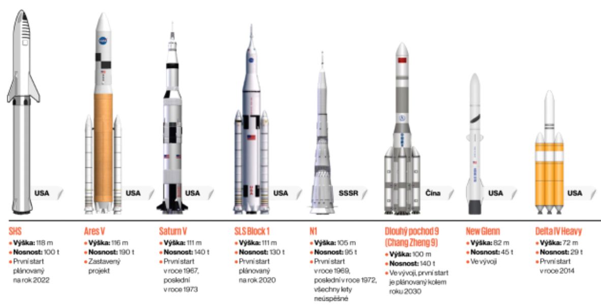 V historickém srovnání těžkých raket je Starship sice největší, ale taky - nejslabší.