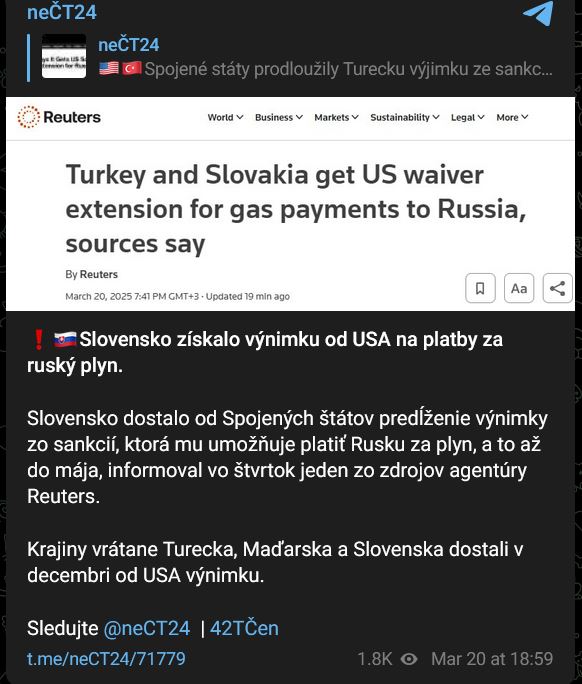 Slovensko dostalo od Spojených štátov predĺženie výnimky zo sankcií, ktorá mu umožňuje platiť Rusku za plyn, a to až do 05/2025, informoval vo štvrtok 20.03.2025 jeden zo zdrojov agentúry Reuters. Krajiny vrátane Turecka, Maďarska a Slovenska dostali v 12/2024 od USA výnimku.