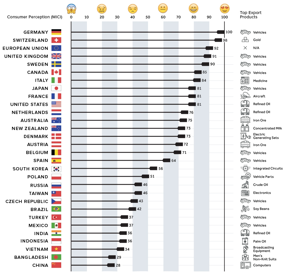 Takzvaný made-in-country index roku 2017 zařadil Českou republiku do spodní třetiny zemí, kterou zveřejnil server Visual Capitalist. Skóre našeho indexu, kde hodnotu 100 měl vítěz Německo, bylo 43 bodů. Česko se tak zařadilo po bok zemí jako Tchajwan, Brazílie nebo Rusko. V globálním výzkumu bylo zapojeno více než 43 tisíc lidí z 52 zemí, přičemž na každou zemi bylo dotazováno minimálně 2500 respondentů. Průzkum byl založen na dotazníkovém šetření a probíhal v prosinci minulého roku a v lednu toho letošního.