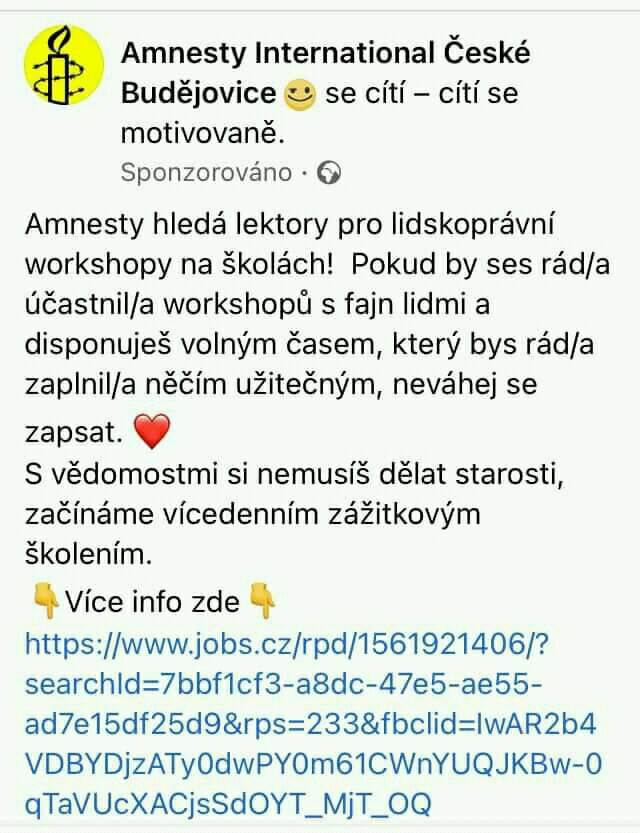 Nezisková organizace Amnesty International z Českých Budějovic hledá lektory, kteří by dětem na základních a středních školách vykládali o lidských právech. Musí být nadšení a platit je nebude. Ale práce je pro změnu skoro pro každého. „Vzdělání není podstatné,“ píše se v inzerátu. A na internetu se už objevily připomínky, jak nevzdělané do odborných pozic verbovala KSČ. „Úplně stejně tam píšou, že předchozí vzdělání není potřeba, to že si doplní za chodu, hlavní je kladný vztah k socialistickému zřízení,“ vzpomněl si lektor ze spolku, který se také zabývá vzděláváním.