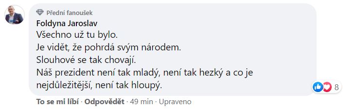 Načež se připojil i poslanec Jaroslav Foldyna. I on srovnal slovenskou hlavu státu s prezidentem Zemanem. „Všechno už tu bylo. Je vidět, že pohrdá svým národem. Slouhové se tak chovají. Náš prezident není tak mladý, není tak hezký a co je nejdůležitější, není tak hloupý,“ dal najevo.