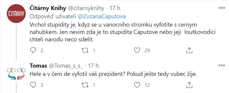Reakci vzbudila i samotná fotografie prezidentky s černou textilní rouškou. „Vrchol stupidity je, když se u vánočního stromku vyfotíte s černým náhubkem. Jen nevím, zda je to stupidita Čaputové nebo její loutkovodiči chtěli národu něco sdělit,“ sneslo se dále v komentářích na Twitteru.