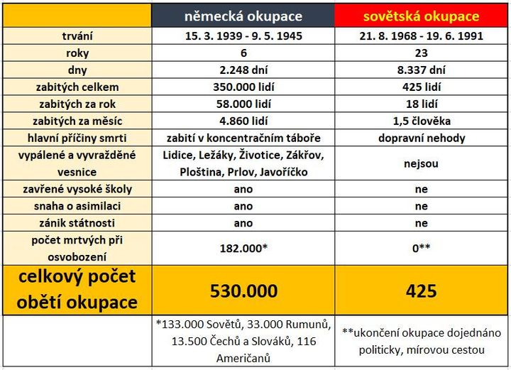 Při příležitosti výročí zahájení okupace zbytku tehdejšího Československa německou armádou dne 15. března 1939 jsem připravil malé srovnání toho, co našemu národu způsobily obě velké okupace, které jsme zažili v minulém století.