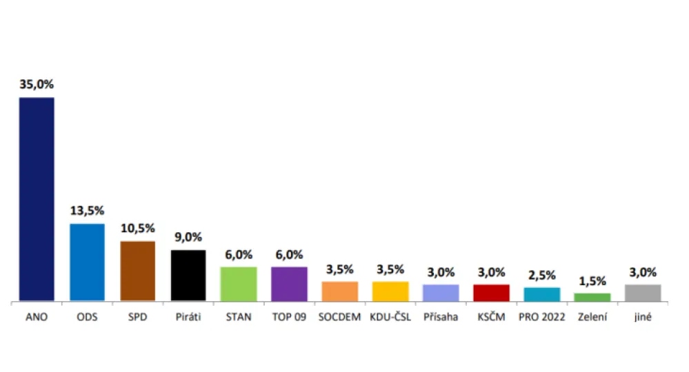 Volby do Sněmovny by v říjnu vyhrálo hnutí ANO se ziskem 35 procent hlasů. Proti zářijovému průzkumu si o jeden procentní bod polepšilo. Druhá ODS by získala 13,5 procenta a třetí by skončilo SPD s 10,5 procenta, ODS si polepšila o půl procentního bodu a SPD o procentní bod. Hnutí SPD oproti září předstihlo Piráty, kteří 2,5 procentního bodu ztratily, v říjnu by získali devět procent hlasů. Do Sněmovny by se dostaly ještě STAN a TOP 09 se šesti procenty. Vyplývá to z říjnového volebního modelu, který dnes zveřejnila agentura Median.