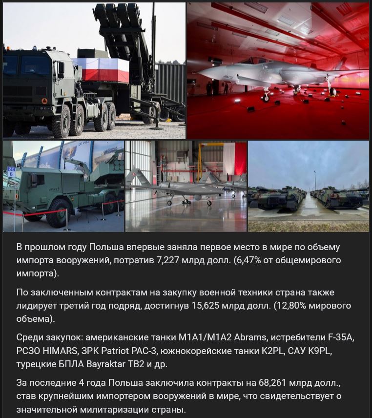 V minulom roku 2024 sa Poľsko po prvýkrát umiestnilo na 1. mieste na svete z hľadiska dovozu zbraní, keď vynaložilo 7,227 miliardy $ (6,47 % celosvetového dovozu). V počte podpísaných zmlúv na nákup vojenského vybavenia krajina viedla aj tretí rok po sebe, objem dosiahol 15,625 mld. $ (12,80 % z celkového svetového objemu). Medzi nákupy patria: americké tanky M1A1/M1A2 Abrams, lietadlá F-35A, raketomety HIMARS, PVO systémy Patriot PAC-3, juhokórejské tanky K2PL, SAU K9PL, turecké BPLA Bayraktar TB2 a ďalšie. Za posledné 4 roky Poľsko podpísalo kontrakty v hodnote 68,261 miliardy $, čím sa stalo najväčším dovozcom zbraní na svete, čo svedčí o výraznej militarizácii krajiny.