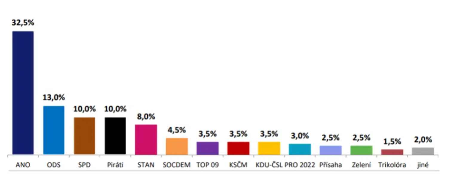 Sněmovní volby by v dubnu vyhrálo hnutí ANO s 32,5 procenta, druhá ODS by měla 13 procent, SPD a Piráti shodně po deseti procentech a hnutí STAN by získalo osm procent hlasů. Další politické strany a uskupení by se do Sněmovny nedostaly, mají podporu méně než pět procent. Vyplývá to z volebního modelu, který ve čtvrtek na svém webu zveřejnila agentura Median. V porovnání s březnem posílilo z vládních stran jen hnutí STAN, výrazněji si polepšila opoziční SPD. Ochota zúčastnit se voleb mírně vzrostla, k volbám by v dubnu přišlo 64,5 procenta voličů. "Oslabení vládních stran lze vysvětlit mimo jiné tím, že nezanedbatelná část jejich dřívějších voličů nyní není rozhodnuta, koho volit. ANO a SPD naopak konsolidují své podporovatelské základny," uvedli autoři průzkumu.