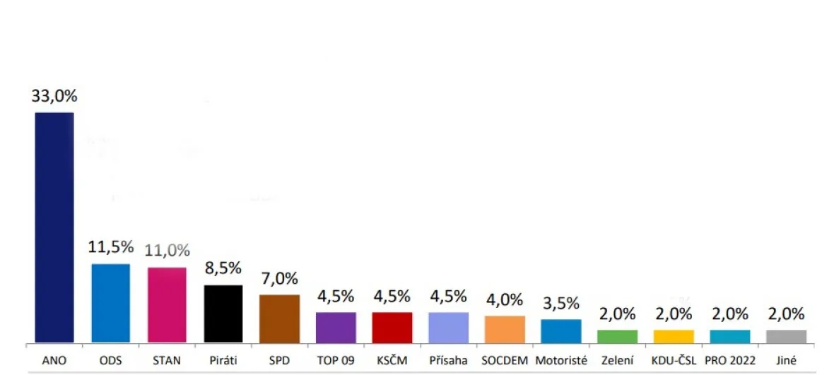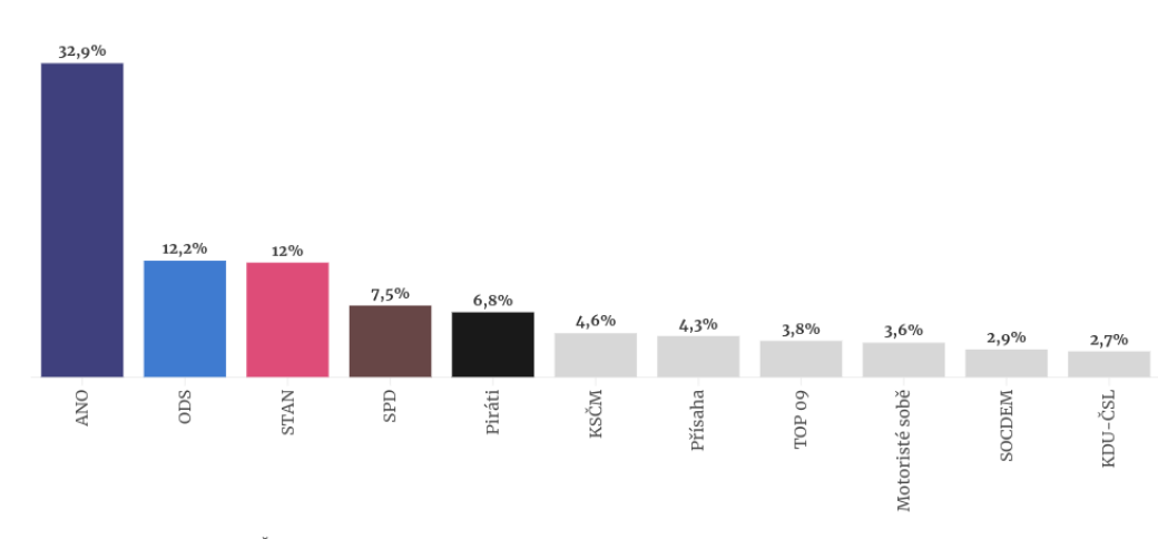 sněmovny vyhrálo hnutí ANO s 32,9 procenty hlasů. Do sněmovny by se podle tohoto průzkumu dostala i ODS a hnutí STAN s přibližně 12 procenty, následovaná SPD s 7,5 procenta a Piráty s 6,8 procenta. Výrazné změny jsou patrné zejména u hnutí STAN, které si oproti září polepšilo o 2,8 procentního bodu, zatímco podpora Pirátů nadále klesá. Do dolní komory by se podle posledního průzkumu nedostaly TOP 09 ani lidovci.