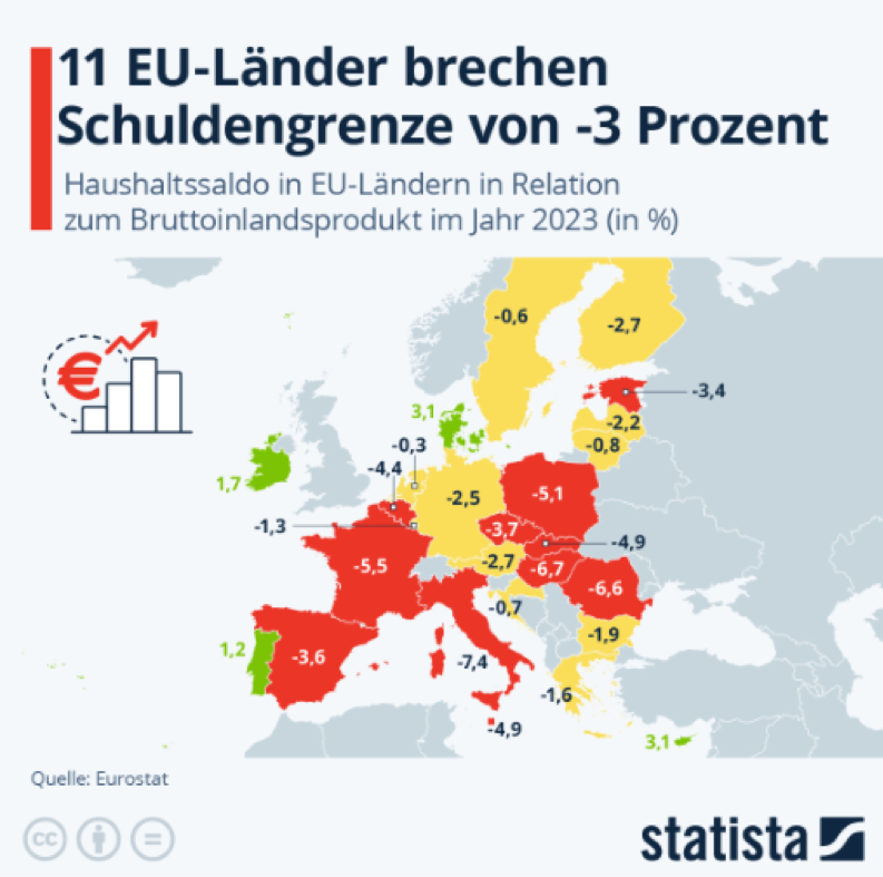 EU stanovila horní hranici pro poměr deficitu krozpočtovým saldům svých členských států na minus tři procenta. Strop EU má zajistit rozpočtovou kázeň v zemích a zaručit zdravé veřejné finance. Ty jsou považovány za důležitý předpoklad stability v EU a eurozóně. Dohoda ukládá sankce těm členským státům, jejichž poměr deficitu veřejných rozpočtů k HDP přesáhne tři procenta. Jak ukazuje infografika webu Statista, tuto hranici loni překročilo 11 zemí. Pouze čtyři země mají kladné rozpočtové saldo, a to Dánsko, Kypr, Irsko a Portugalsko. Zdrojem dat je Eurostat.
