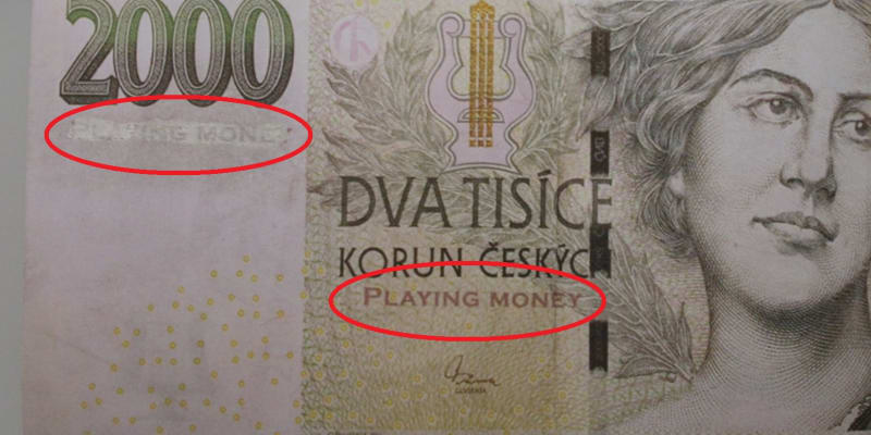 Na první pohled vypadá dvoutisícovka zcela normálně. Ovšem při pečlivějším zkoumání člověk rozdíly pozná. Na všech se objevuje nápis „PLAYING MONEY“. „Při přijímání finanční hotovosti je důležité být obezřetný a věnovat bankovkám patřičnou pozornost. Nápisy mohou být částečně odstraněné nebo dobře viditelné. Neplatnou bankovku je tak možné poměrně snadno rozpoznat,“ upozornila policie s tím, že je nutné si přijatou finanční hotovost vždy hned zkontrolovat.