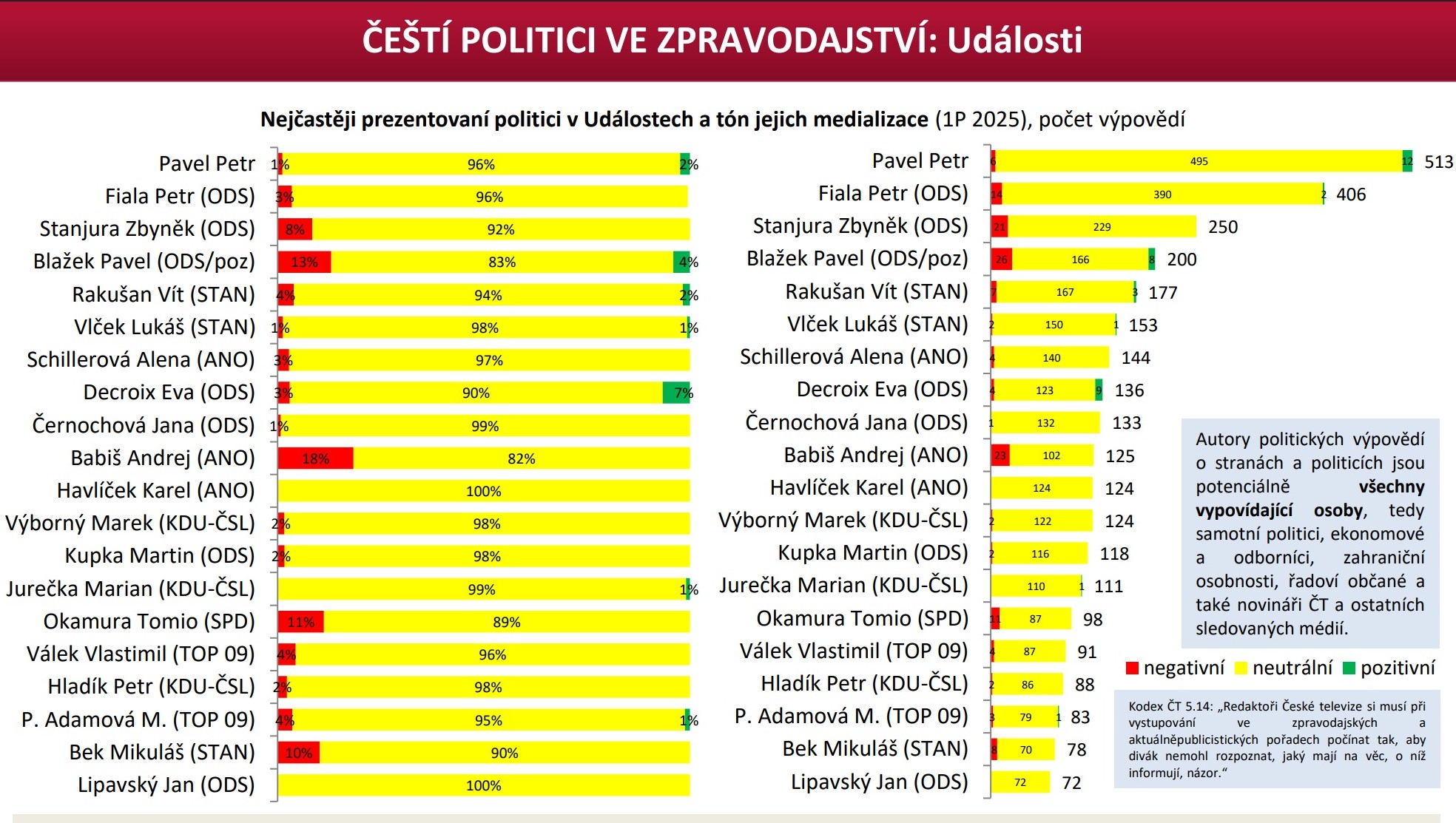 Člen Rady České televize Pavel Matocha poukazuje na analýzu společnosti Media Tenor, podle níž má zpravodajství Událostí České televize nejvíce negativní tón vůči předsedovi hnutí ANO Andreji Babišovi. Podle Matochy to dokazuje, že ČT přistupuje k opozici přísněji než k vládním politikům.