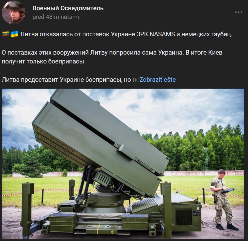 O dodanie týchto zbraní požiadala Litvu samotná Ukrajina. V dôsledku toho Kyjev dostane len muníciu. Litva bude dodávať Ukrajine muníciu, ale nebude jej dodávať nórske protilietadlové raketové systémy (PVO) NASAMS a nemecké samohybné delostrelecké kanóny Panzerhaubitze 2000, uvádza LRT. Minister obrany krajiny Arvydas Anušauskas odmietol vysvetliť, prečo bolo prijaté rozhodnutie odmietnuť dodávku do Kyjeva. Anušauskas upozornil, že zasadnutie Rady obrany štátu, na ktorom sa o tejto otázke diskutovalo, bolo neverejné, takže sa k tomu nemohol vyjadriť. Kyjev požiadal o dodávky, upozorňuje LRT. Minister uviedol, že Litva podporila Ukrajinu sumou viac ako 640 miliónov € vrátane vojenských dodávok v hodnote 232 miliónov € (spolu 872 miliónov €).