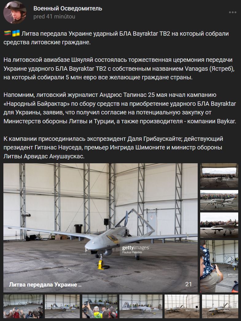 Stovky Litovčanov sa zapojili do fundraisingovej kampane, ktorej cieľom je nákup vojenského bezpilotného dronu Bayraktar TB2 pre Ukrajinu. Ako informovala litovská internetová televízia Laisvés TV, ktorá túto iniciatívu spustila pred 3 dňami, do soboty 28.05.2022 sa podarilo vyzbierať už približne 3 milióny € - potrebných je 5 miliónov...V uplynulých rokoch Ukrajina nakúpila od tureckej spoločnosti Baykar viac ako 20 dronov Bayraktar TB2 a 27.01.2022 si objednala ďalších 16 kusov. Táto zásielka bola doručená začiatkom 03/2022....Agné Belickaité, ktorá sa do zbierky zapojila sumou 100€, poznamenala, že pred začiatkom vojny na Ukrajine nikdy nepomyslela na to, že bude raz prispievať na nákup zbraní. "Teraz je to však normálna vec. Je potrebné spraviť niečo pre to, aby bol svet lepší," povedala. Dodala, že peniaze na nákup zbraní bude posielať dovtedy, kým Ukrajina nezvíťazí. Ako priznala pre Reuters, v tomto úsilí ju čiastočne motivujú aj obavy, že Rusko by mohlo napadnúť aj Litvu...