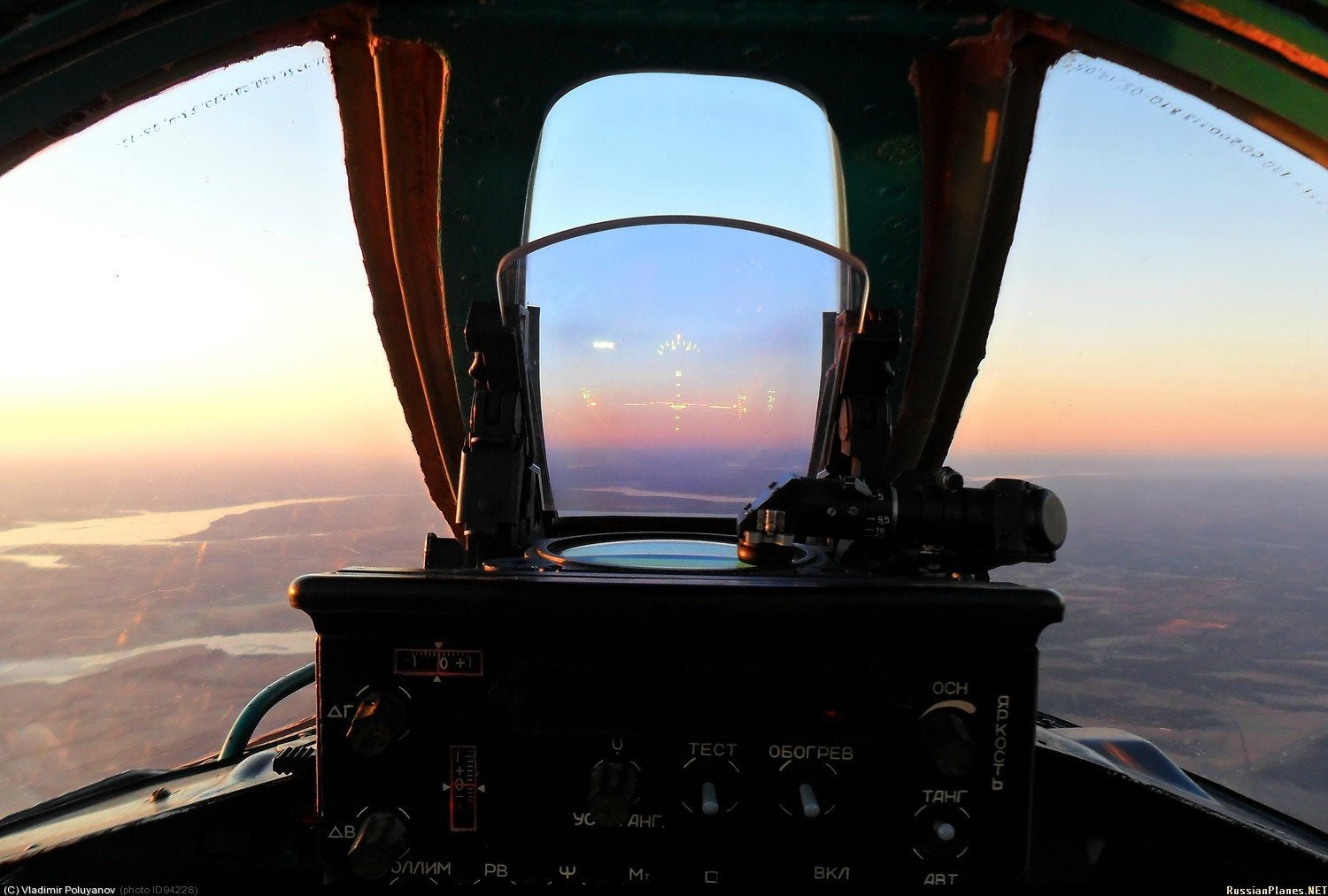 To už je od doby toho sovětského modelu HUD (IKŠ-1?) to stínítko - používají staré verze Mig-29, Su-27, Su-25 ale i Ka-50, Mi-28N. Ale pro let do slunce tam mají výklopné tmavé sklo▼. Ale takový MiG-31 ho nemá - má jiný typ HUD a má také jinou symboliku▼▼.