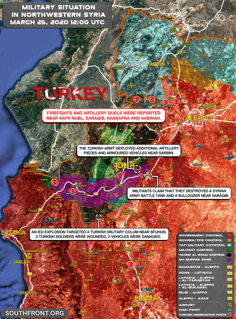 Turecké a ruské sily 23. marca uskutočnili druhú „obmedzenú“ spoločnú hliadku v rámci novej dohody o de eskalácii Idlibu, ktorá sa nedávno dosiahla v Moskve. Na hliadke sa údajne zúčastňovalo 6 kusov vojenskej techniky (3 - turecká a 3 - ruská) a konala sa na krátkom úseku diaľnice M4 západne od Sraqibu.