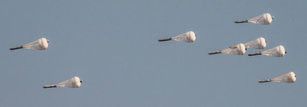 Však tam jsou jasně vidět 3 kusy bez padáku a poslední kus je brzděný padákem. To bude něco nového, není to konstrukce RBK, ale fyzicky se to odděluje po čtvrtinách (a délka se krátí) o hmotnosti cca 100-125kg.