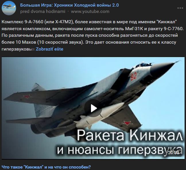 Komplex 9-A-7660 (alebo Ch-47M2 (Х-47М2)), medzinárodne známejší ako "Kinžal" (Кинжал), je systém pozostávajúci z nosného lietadla MiG-31K (МиГ-31К) a rakety 9-S-7760 (9-С-7760). Podľa rôznych správ je strela po odpálení schopná zrýchliť na rýchlosť presahujúcu Mach 10 (10x rýchlosť zvuku). To dáva dôvod klasifikovať ju ako hypersonickú, čím sa Kinžal automaticky stáva prvou sériovo vyrábanou hypersonickou zbraňou na svete. V tomto videu preskúmame pôvod tohto komplexu, zoznámime sa s jeho vlastnosťami a pokúsime sa zistiť, či je skutočne hypersonický.