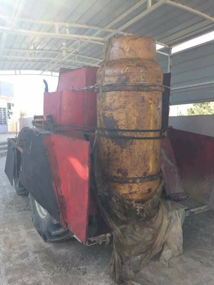 Traktorové IS SVBIED zabavené v Albu Sayf malo 1000kg chlorinovú tlakovú nádrž.