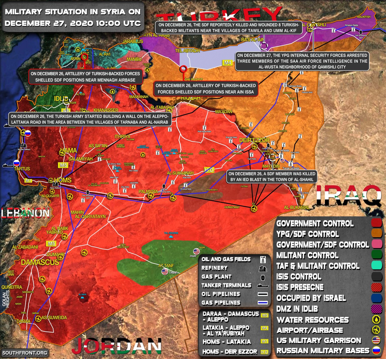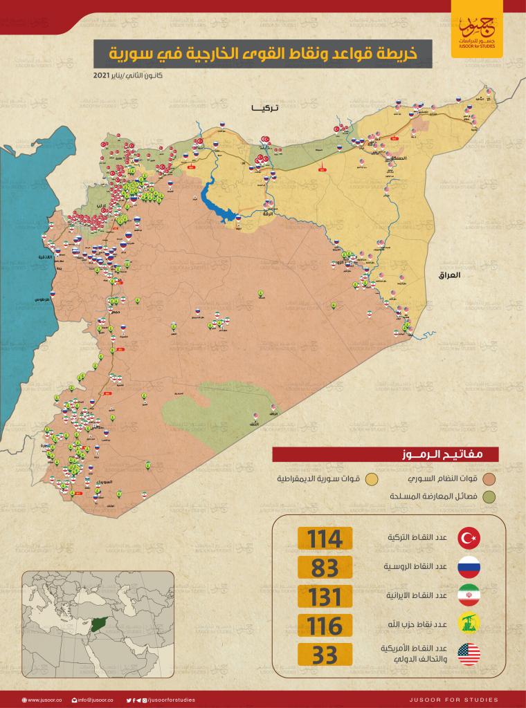 Významné územia na východe a severovýchode krajiny sú zároveň stále pod kontrolou amerických vojakov a v sýrskej púšti sa opäť objavili teroristi z IS (organizácia zakázaná v Rusku). Polovicu severnej Sýrie okupuje Turecko a niektorí Kurdi sa usilujú o vytvorenie nezávislého Kurdistanu.