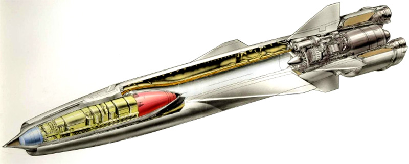 Za kormidlami vidno "valcovité teleso". Je to vlastne prstenec okolo výstupnej trysky prúdového motoru a v tomto prstenci je uložený štartovací raketový motor. Po vynorení z vody sú odpálené kryty, odhodený prstenec s raketovým motorom a je naštartovaný letový prúdový motor.