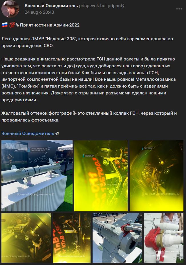 Naša redakcia sa podrobne pozrela na GSN (navádzacia hlavica) tejto rakety a bola príjemne prekvapená skutočnosťou, že raketa je vyrobená z domácej základne komponentov od a do (kamkoľvek naše oči dosiahli)! Bez ohľadu na to, ako veľmi sme sa do GSN pozerali, nemohli sme nájsť žiadnu importovanú základňu komponentov! Všetko je naše, pôvodné! Metallokeramika (IMS) (Металлокерамика (ИМС)), "Rombiki" (Ромбики) a piata akceptácia - všetko je tak, ako má byť s vojenskými výrobkami. Dokonca aj zostava odtrhávacieho konektora je vyrobená našimi spoločnosťami.