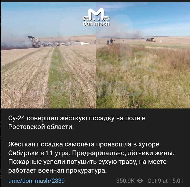 Suchoj Su-24 (Су-24) tvrdo pristál na poli v Rostovskej oblasti. Lietadlo okolo 11:00 hod. tvrdo pristálo pri obci Sibirki (Сибирьки). Predbežne sú piloti nažive (katapultovali sa). Hasičom sa podarilo uhasiť suchú trávu a na mieste pracuje vojenská prokuratúra.