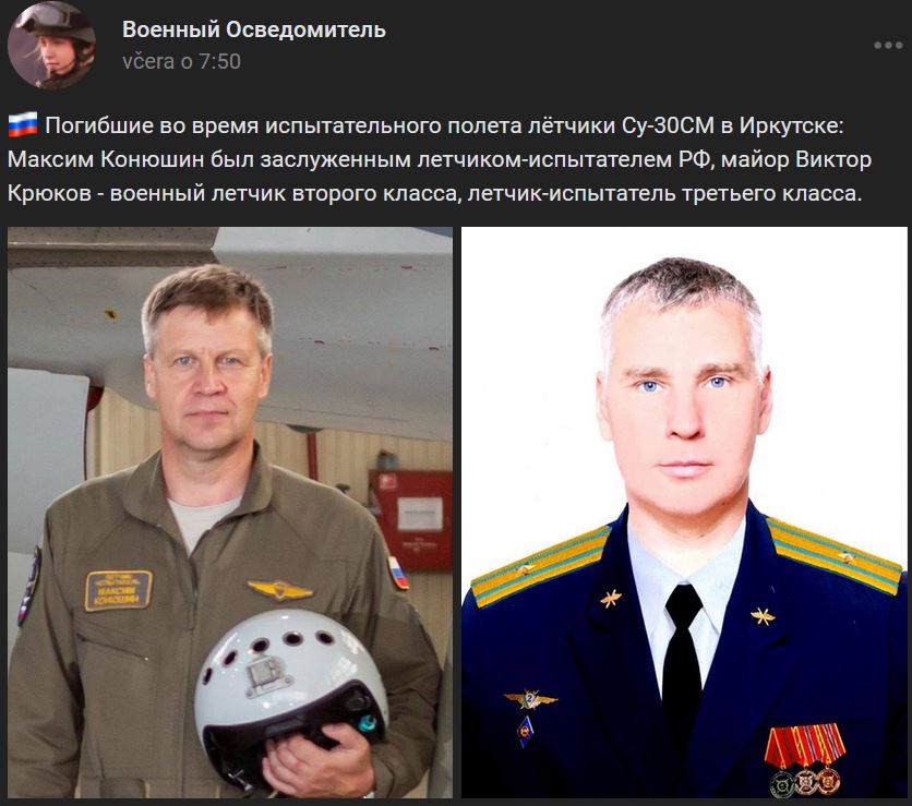 Testovací piloti Irkutského leteckého závodu ktorí pilotovali lietadlo Suchoj Su-30SM, a ktorí zahynuli počas skúšobného letu v Irkutsku: Maksim Konjušin (Максим Конюшин) bol vynikajúci ruský skúšobný pilot, major Viktor Krjukov (Виктор Крюков) bol vojenský pilot II. triedy a skúšobný pilot III. triedy. Zdroj https://vk.com/wall-123538639_3148946 z 24.10.2022 + viac info o pilotoch https://vk.com/wall-151878956_3089852 / https://ircity.ru/text/society/2022/10/24/71760089/ / https://vk.com/wall-173678697_292816 ...