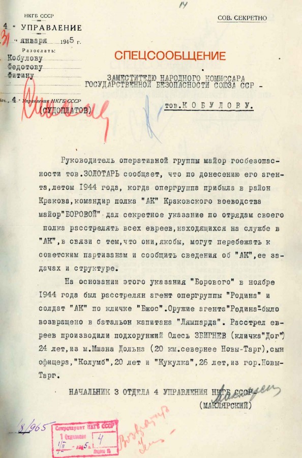 „… velitel pluku „AK“ Krakovského vojvodství, polský důstojník, major dělostřelectva Adam Stabrava, vydal tajný rozkaz oddílům svého pluku zastřelit všechny Židy, kteří jsou ve službách AK a to kvůli tomu, že údajně mohou přeběhnout k sovětským partyzánům a poskytovat informace o AK, jejích úkolech a struktuře“. „… v oddílech AK probíhá čistka důstojníků. Celý starý velitelský štáb je uvolněn ze svých funkcí a na jejich místo jsou jmenováni polští důstojníci vyslaní z Anglie. … osoby, které sympatizují se Sovětským svazem, stejně jako osoby spojené se sovětskými partyzány, jsou vrchním velením AK fyzicky likvidováni“.