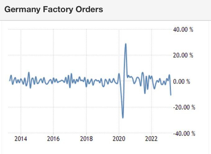 Objednávky v německých továrnách klesly o 10 %, což je největší pokles od vyhlášení karantény. Špatně si vedou automobily (-12 %), stavební strojírenství (-14 %). @banksta